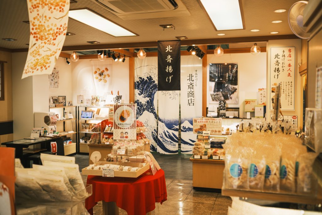 壁面に描かれた北斎の「神奈川沖 浪裏」が眼を惹く東あられ本鋪本店は平成15年に増床開店したが、東あられ本鋪自体には創業115年という長い歴史がある。