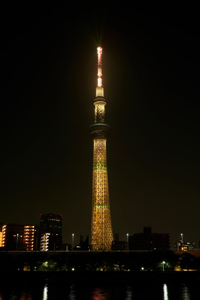 「エレガントツリー」は大人も楽しめる上質な配色。特にトップに位置するゲイン塔をゴールドとレッドの縦割りで彩る手法は珍しく、ぜひ東京スカイツリーのライティングは多様な表現ができるということを知っていただきたいとのことだった。