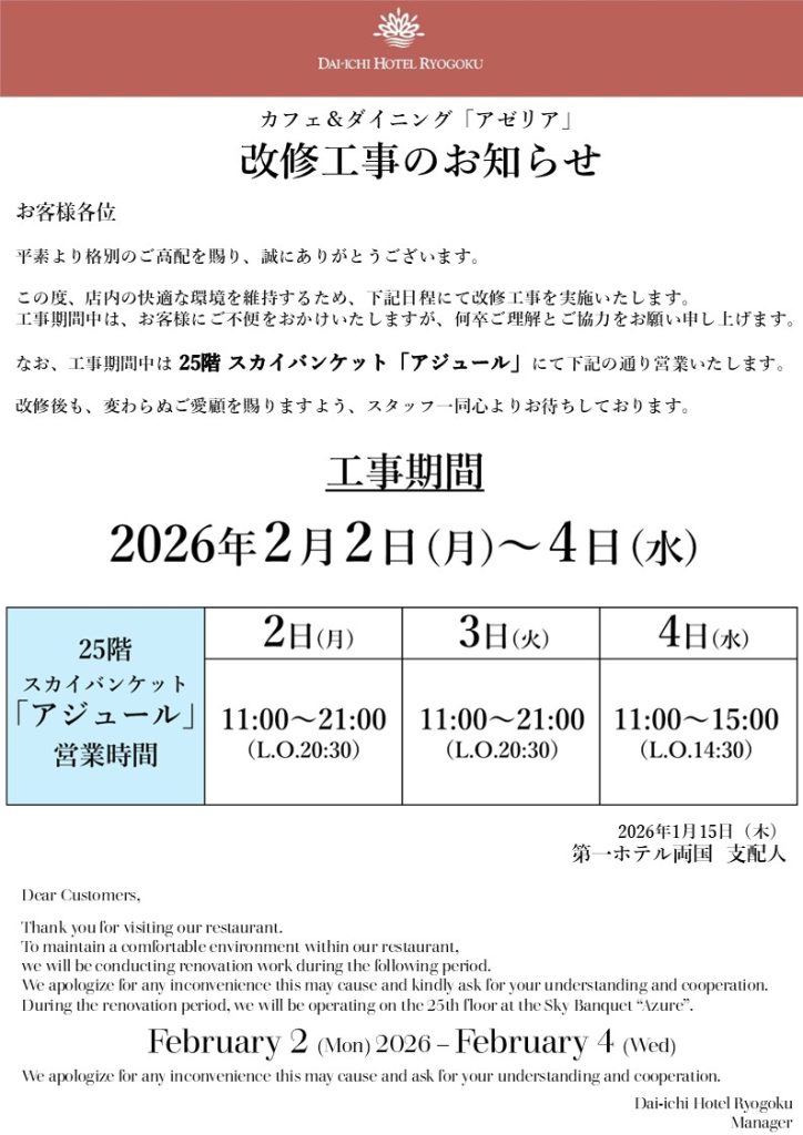 カフェ&ダイニング「アゼリア」改修工事のお知らせ