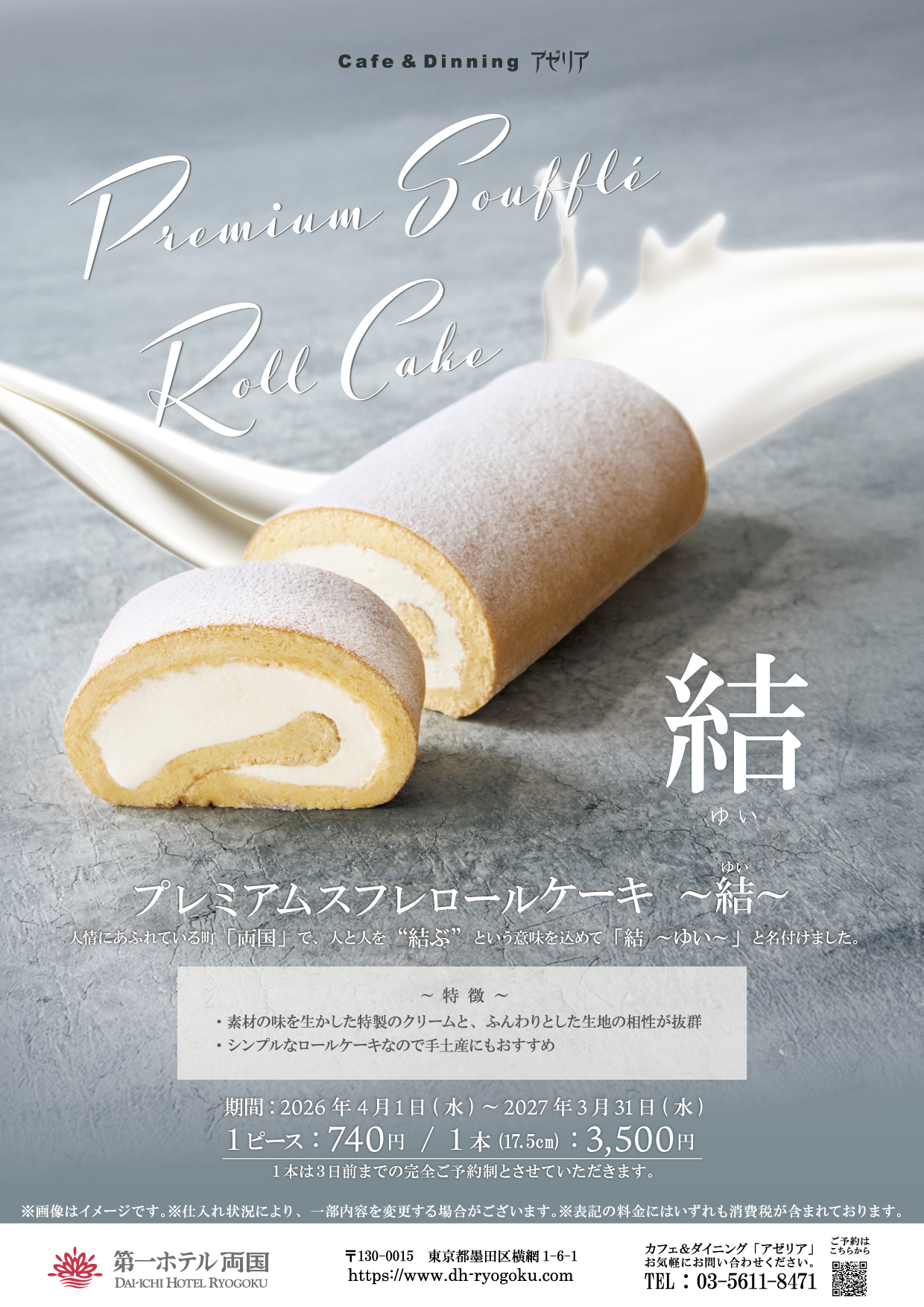 1階 カフェ&ダイニング「アゼリア」では、プレミアムスフレロールケーキを販売しております。