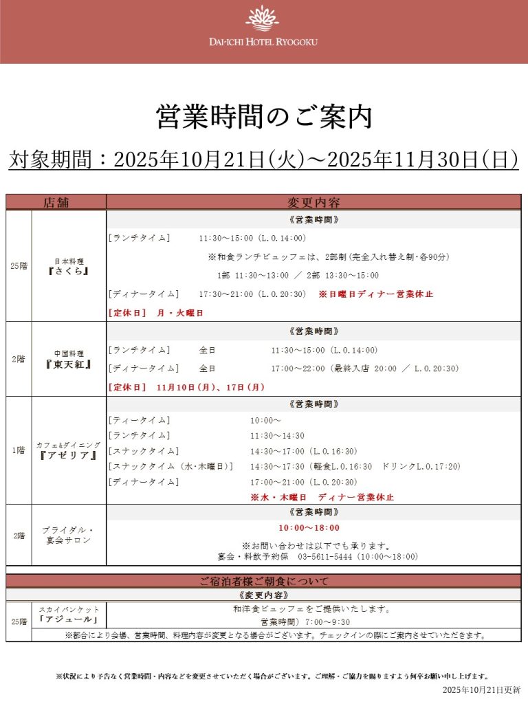 日本料理 さくら、カフェ&ダイニング アゼリア 料金改定についてのご案内