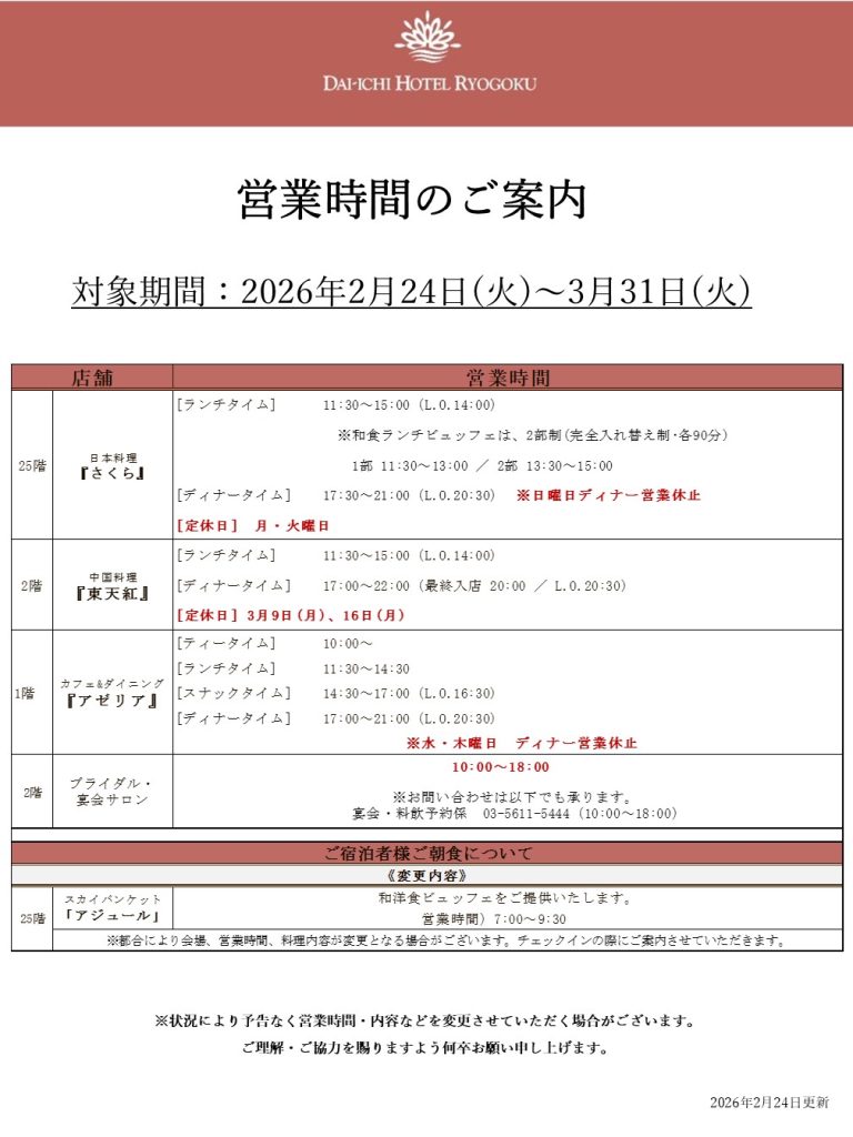 レストラン営業時間の変更および臨時休業について